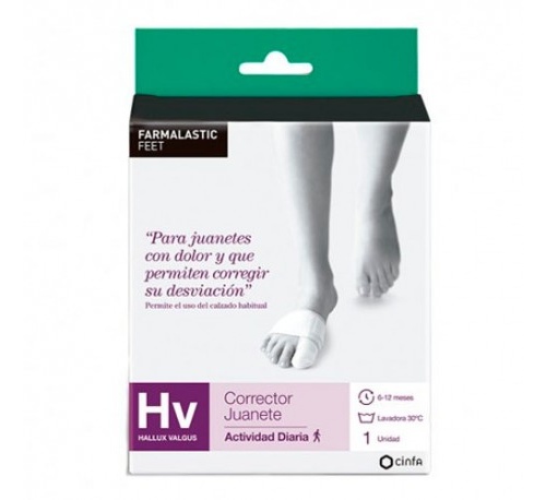 Ayuda a corregir y limitar la evolución el juante (Hallux Valgus) y contribuye a aliviar los dolores articulares relacionados y los ocasionados por el roce. El corrector de juanete, patentado a diferencia de los correctores rígidos, se utiliza durante la jornada gracias a su diseño flexible y ultra-fino. Realinea el 1er dedo del pie con forma regulable y también el 1er metatarsiano, a la vez que ayuda a aliviar el dolor, tanto articular como por roce. Llevándolo a diario con cualquier tipo de calzado, no sólo corrige y ayuda a aliviar el dolor, también limita la progresión del juanete. Silicona 58%, poliamida/elastano 42%.Producto sanitario. Clase I.